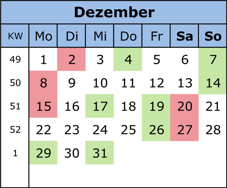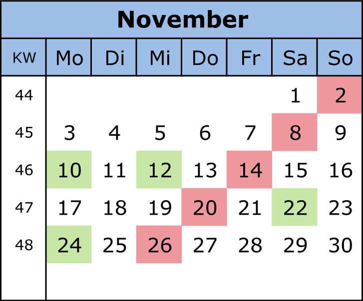 Mein Gute-Tage-Kalender richtet sich an alle, die sich gerne etwas unterstützen lassen. Ich kann Ihnen die Qual der Wahl nicht abnehmen, wie Sie Ihre Termine legen. Doch ich kann Ihnen die grün markierten Termine für Wichtiges ans Herz legen.